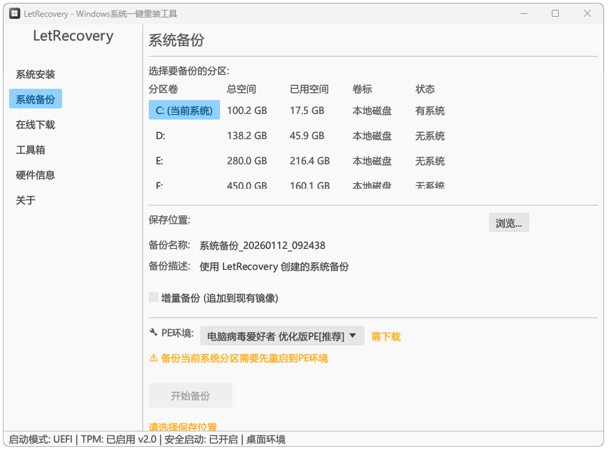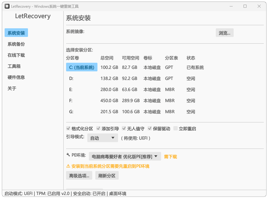 LetRecovery 是一款基于 Rust 开发的免费开源 Windows 系统重装工具,支持 WIM/ESD/GHO/ISO